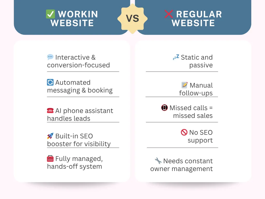 Absolutely — we’ve got you covered! While the Workin Website is our most popular package, we also offer separate plans for AI customer engagement (chat or voice agents), reputation building, and local SEO. If you’re interested in just one or two of those services, simply book aa free discovery call and we’ll walk you through the options to find the best fit for your needs.